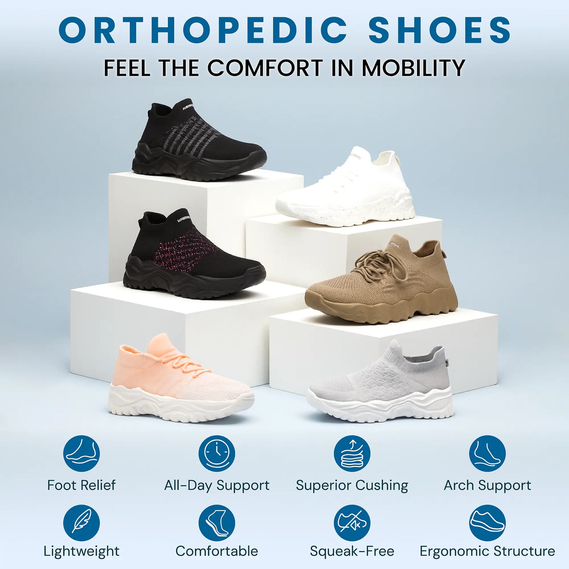Remember what it felt like to finish a shift without sore, burning feet? With OrthoWalk, that feeling returns. These sneakers are designed for women who spend long hours caring for others — and deserve comfort that cares for them back. Whether you have narrow or wide feet, the stretch-fit design gives you a precise, supportive fit all day long."
