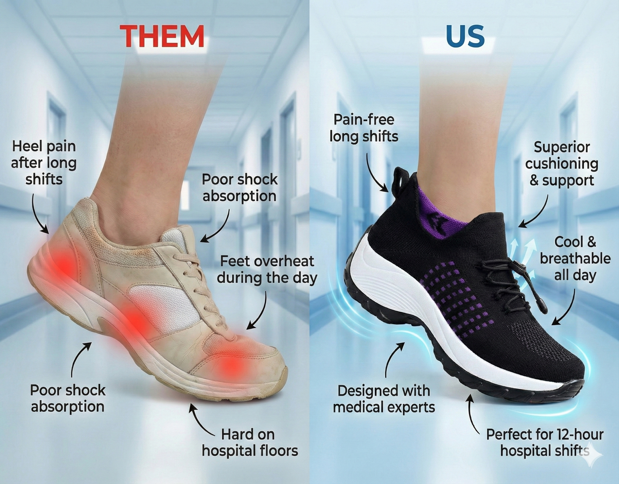 Supports natural walking and better posture during long hospital shifts.