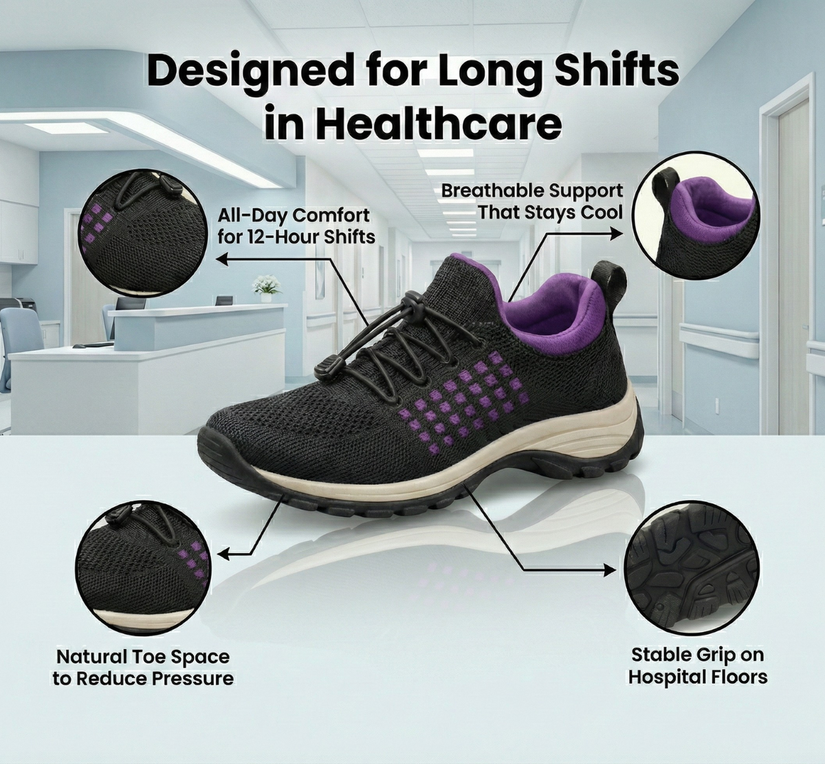 A secure, non-slip sole keeps you steady on fast-paced hospital floors.
